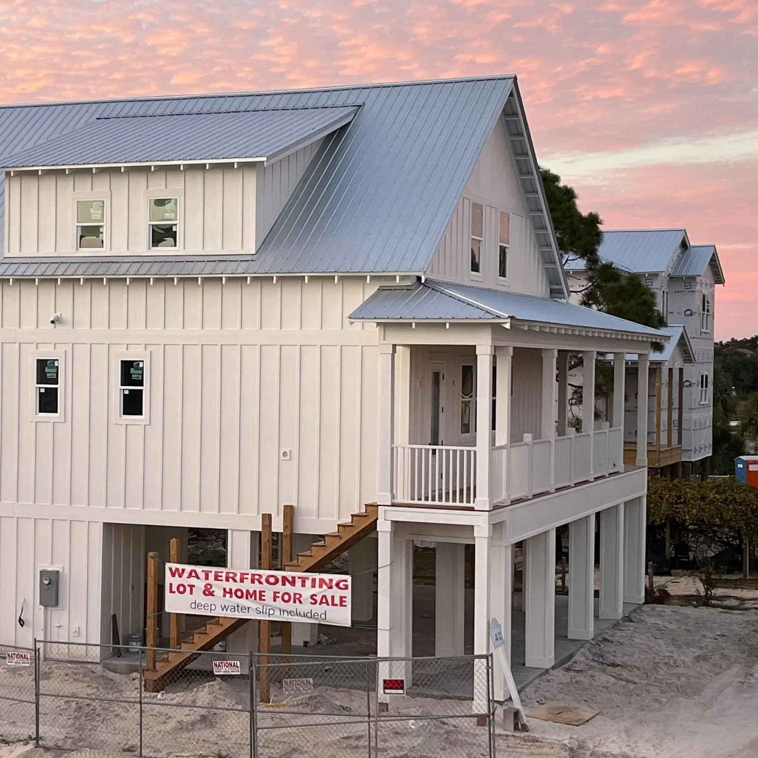 Lot 1 house (sister house to Lot 2) under construction - view from boat dock.